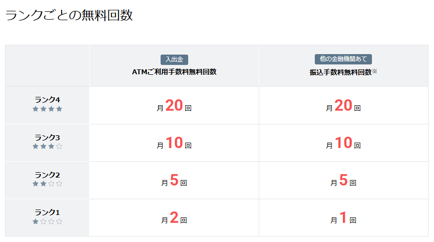 ランクをあげれば無料回数は増えますが、達成条件が厳しいので振込や入出金を5回以内にすることを目指しましょう。